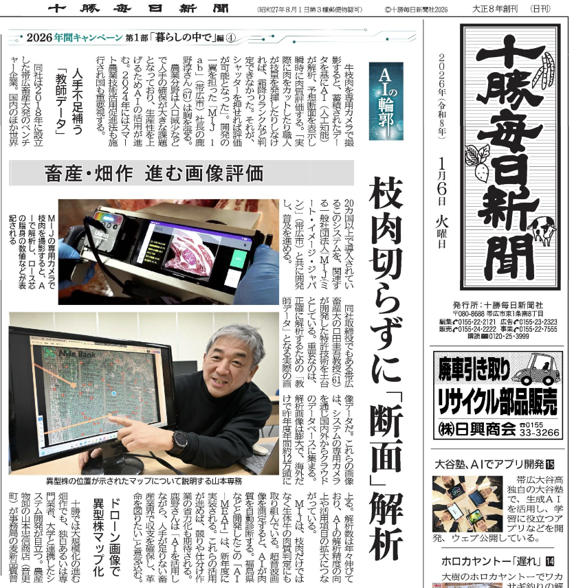 Our AI-driven beef carcass analysis technology has been featured in the digital edition of the Tokachi Mainichi Newspaper. The article highlights recent developments in our imaging and analysis systems and their application within the livestock industry.